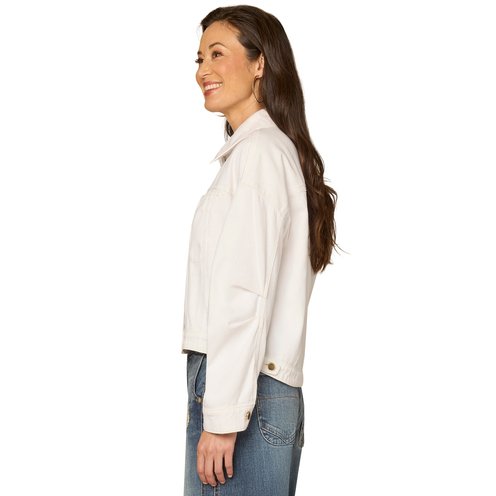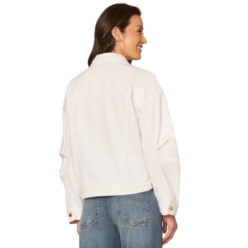 A classic denim jacket designed with long oversized barrel sleeves, a collar neckline, a button?down front, welt pockets, and a hi?low hem.