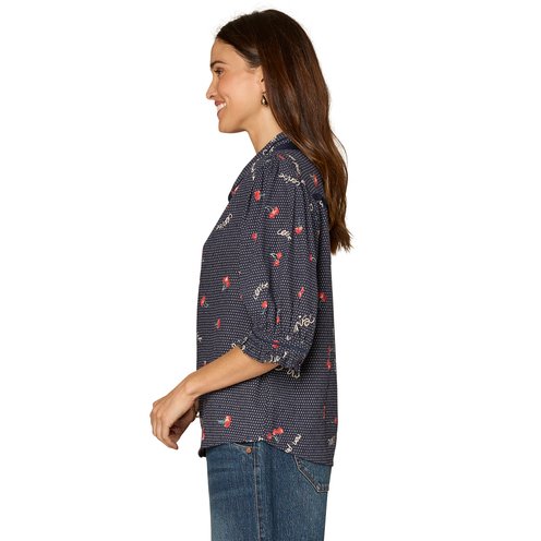 This woven top features below the elbow cinched sleeves, a collared neck, classic button down front, and a fun polka dot, cherry, and cursive script print. Perfect for everyday ease.