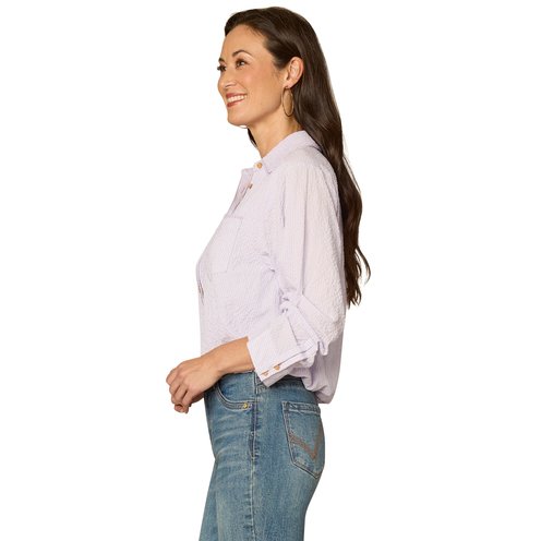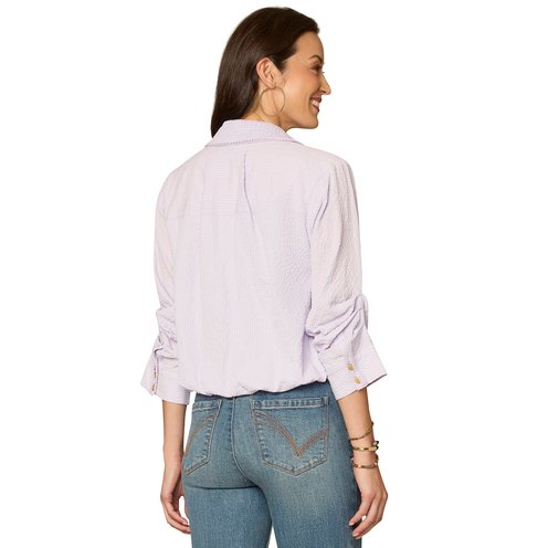 This woven style features three?quarter tucked sleeves, an embroidered scallop pocket, a bubble hem, spliced stripes, and a fun crinkled texture.