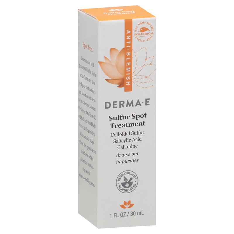 100% vegan. Soy free. Gluten free. Anti-blemish. Eco-ethical. Colloidal saliscylic acid calamine draws out impurities. Dermatologist recommended. Due to the use of some natural ingredients, the color of this product may slightly alter over time. Sport free. Formulated with potent Colloidal Sulfur and Calamine, this unique, fast-acting spot solution absorbs excess oils and sebum. Clarifying Tea Tree Oil and Salicylic Acid help draw out impurities. Niacinamide helps reduce the appearance of redness while Allantoin softens to reveal clearer-looking skin. Ethical Beauty. Clean, effective and dermatologist recommended, we are committed to your skin health, well-being and the natural environment. That's the Derma E difference. Since 1984, we are committed, to skin health and safety: No parabens, no phthalates, no formaldehyde, no petrolatum, no sulfates, no mineral oils, no artificial colors, no artificial fragrances. dermae.com. Cruelty free. Recylable. Wind energy (certificates). We are committed to removing all non-recyclables and reducing plastic. Wind energy (Certificates). Made in the USA of foreign and domestic components.