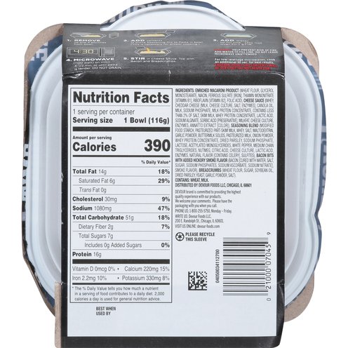 Pasta drenched in a creamy cheese sauce with alfredo seasoning topped with breadcrumbs and hearty pieces of crispy bacon. Devour brand is committed to providing the highest quality experience with our products. Please recycle this sleeve.