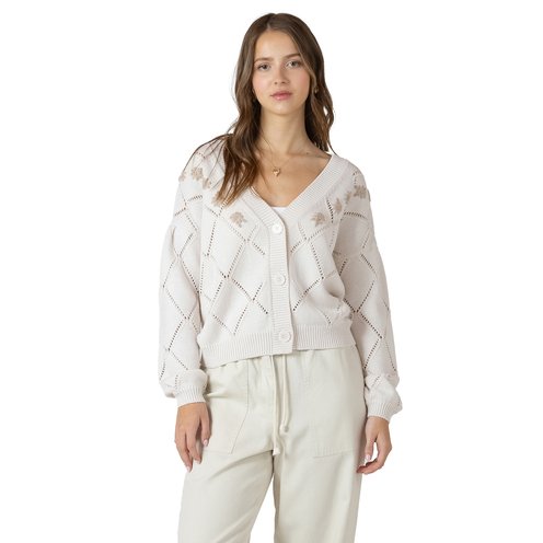 This Dex soft open-knit cardigan with delicate floral details is a light, airy, and effortlessly feminine for everyday styling.