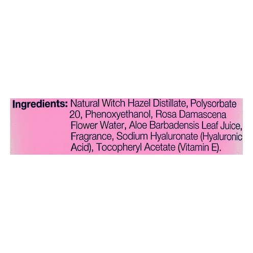 Ingredients: Natural Witch Hazel Distillate, Polysorbate 20, Phenoxyethanol, Rosa Damascena Rower Water, Aloe Barbadensis Leaf Juice, Fragrance, Sodium Hyaluronate (Hyaluronic Acid), Tocopheryl Acetate (Vitamin E).