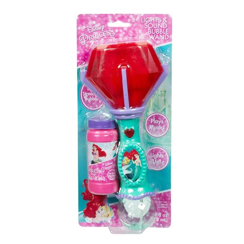 The Disney Ariel Little Mermaid Light and Sound Bubble Wand offers magical entertainment for children aged 3 and up. This charming bubble wand features an easy-to-use on/off button that lights up and plays whimsical music. It comes with a 4oz bottle of premium bubble solution, ensuring hours of fun. Perfect for playdates, parties, or just a sunny day in the backyard. The wand requires three AAA batteries, which are not included. It's an enchanting addition to any young Ariel fan's toy collection. Join Ariel on a bubbly adventure today!