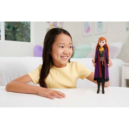 Meet this Anna doll, inspired by the fearless and optimistic heroine from Disney's Frozen 2! This posable fashion doll is shown in her signature travel look, with accessories that include boots and a soft cape and skirt. In her signature outfit from the movie, this Anna doll is ready to embark on a journey far from home! Doll cannot stand alone. Colors and decorations may vary.