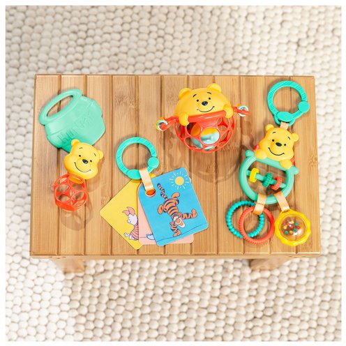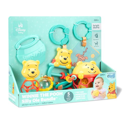 Celebrate 100 years of friendship, hunny, and everyones favorite silly old bear with the Disney Baby Winnie the Pooh Silly Ole Bundle Gift Set from Bright Starts! Thoughtfully designed to engage and entertain your little one through their early developmental journey, it features five Pooh-themed sensory baby toys: an activity toy, Oball, baby rattle, and teether, and flash cards. This set is packed with playful opportunities to nurture babys growth, including auditory stimulation, pincer grasp, and fine motor skill development! Plus, the honey pot teether soothes aching gums during teething time. Perfect for both playtime and comfort, these toys, featuring the timeless charm of Winnie the Pooh, will capture your little ones imagination while supporting milestones. Lightweight and easy to take on the go, you can add this set to your collection of carrier toys and stroller toys. Introduce baby to the exciting world of Winnie the Pooh and add a pinch of nostalgic magic for parents at baby showers, birthdays, and holidays like Christmas and Hanukkah. Newborn toys designed for 0 months and up.