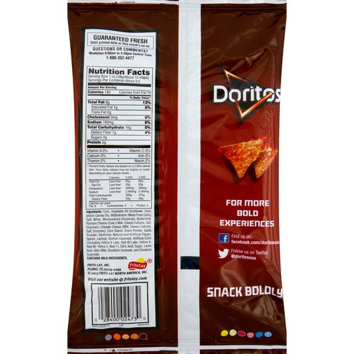 - Corn, Vegetable Oil (Sunflower, Corn, and/or Canola Oil), Maltodextrin (Made from Corn), Salt, Whey, Monosodium Glutamate, Buttermilk, Romano Cheese (Cow's Milk, Cheese Cultures, Salt, Enzymes), Corn Starch, Onion Powder, Garlic Powder, Dextrose, Natural and Artificial Flavor, Spices, Lactose, Sodium Caseinate, Artificial Color (Including Yellow 6 Lake, Red 40 Lake, Yellow 6, Red 40, Yellow 5, Blue 1), Citric Acid, Sugar, Lactic Acid, Skim Milk, Disodium Inosinate, and Disodium Guanylate.