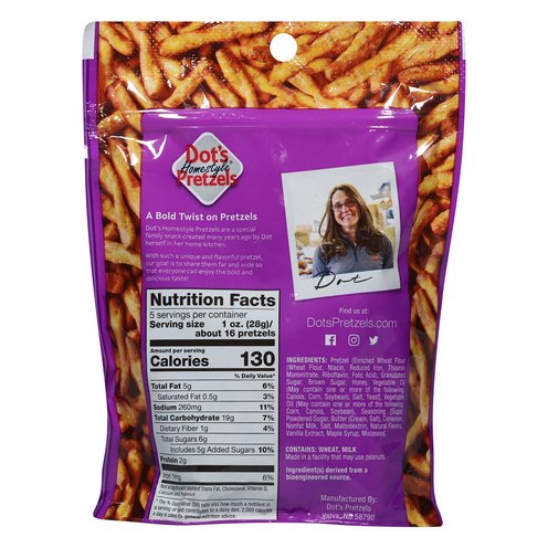 DOT'S HOMESTYLE PRETZELS Cinnamon Sugar Pretzel Twists are baked to perfection and specially seasoned with a blend of sweet and toasty spices. DOT'S Pretzels have a satisfying crunch with tempting buttery flavor in every delicious twist.
