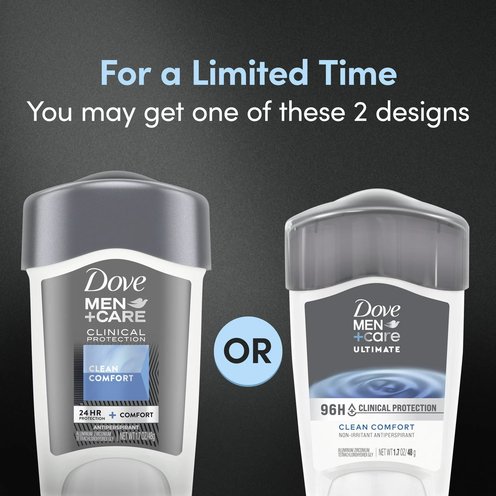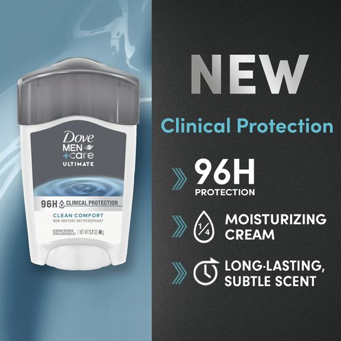 Dove Men+Care Clinical Protection Clean Comfort Antiperspirant Stick gives you 96h sweat protection while caring for sensitive skin. This antiperspirant stick is formulated with 1/4 Moisturizing Cream to help retain skin moisture and help protect against irritation for more comfortable underarms. This Clinical Strength antiperspirant features a long-lasting subtle fragrance to keep you feeling fresh and confident all day. Simply apply this clinical strength antiperspirant in an even layer onto each of your underarms to help soothe and protect your underarms from sweat and odor for lasting confidence around the clock. Looking for more Dove Men+Care skin care products? Try the full range of Dove Men+Care products, including antiperspirant deodorants, dry spray antiperspirant deodorants, body washes, face and body bars, and other hair and skin care products. Each Dove Men+Care antiperspirant stick can be recycled. Follow the How2Recycle instructions on the back. All Dove products, including this antiperspirant deodorant, are PETA-certified cruelty-free. Globally, Dove does not test on animals.