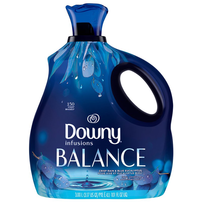 Downy Infusions BALANCE Liquid Fabric Softener gives your laundry 3x longer lasting scent and irresistible softness that smells as good as it feels. Just measure and pour for the added scent of Crisp Rain& Blue Eucalyptus.