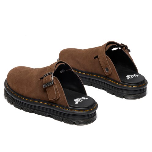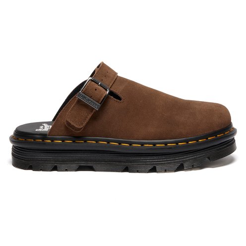 The Zebzag mule is our latest innovation in comfort: built on a hybrid air-cushioned sole that fuses feather-weight EVA with rugged PVC. Crafted from lightweight, versatile suede, they’re designed to be worn however you feel like – in summer or out of the conventional season. The adjustable strap ensures a secure fit, while the welted construction delivers our signature durability. Yellow welt stitching marks the mules as Dr. Martens.