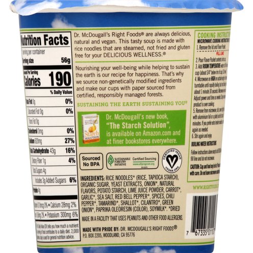 Certified gluten-free. Certified vegan. vegan.org. Non GMO Project verified. Dr. McDougall's right foods are always delicious, natural and vegan. This tasty soup is made with rice noodles that are steamed, not fried and gluten free for your delicious wellness. Nourishing your well-being while helping to sustain the earth is our recipe for happiness. That's why we source non-genetically modified ingredients and make our cups with paper sourced from certified, responsibly managed forests.