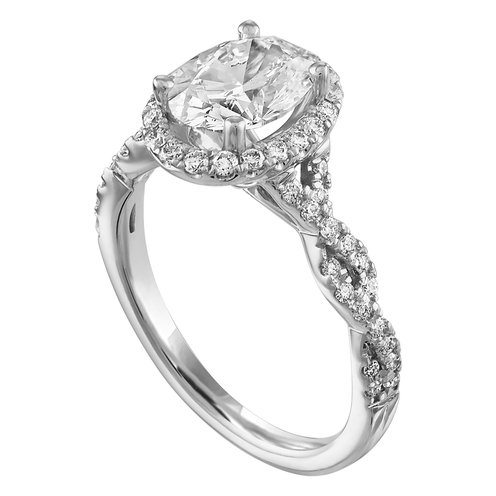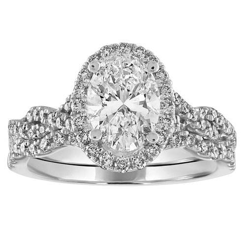 With a delicate twisting motif, this bridal set is the perfect symbol of intertwining of two lives into one. Crafted in glistening 14K white gold, it features a dazzling oval lab-grown diamond, 1 1/2 cts., with 75 round lab-grown diamonds, 5/8 ct., for a total carat weight of 2 1/8 cts. All diamonds are E-F/VS2-SI1. Finger size 7.