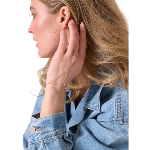 Soft lines, bold energy. Designed with a fine gold chain and pear and round stones, the Runaway Hand Chain traces the top of the hand for a refined, modern statement.