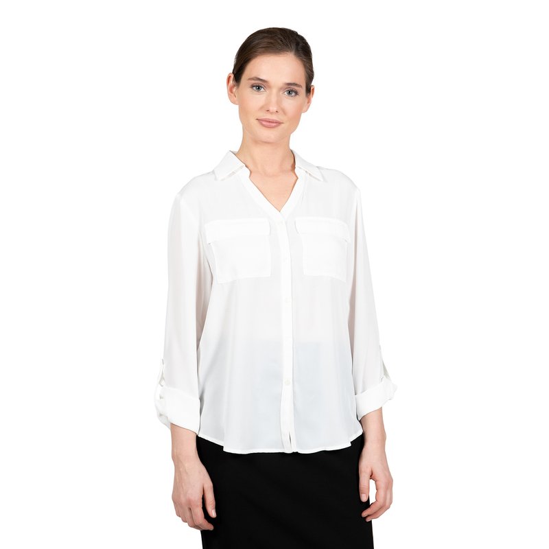 This roll up sleeve utility shirt is comfortable but trendy for any occasion. Features buttons for closing and opening, and two pockets. Comes in black or soft white which s perfect solid coloring for effortless matching.