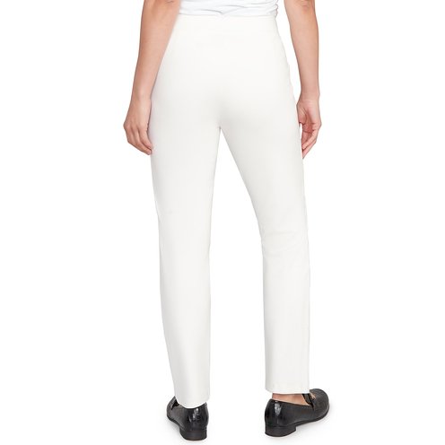 Sleek solid ponte ankle pants featuring a stylish logo tab on the waistline for a modern, polished look.