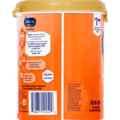 0-12 months. Milk-based powder with iron. Non-GMO. Makes approx. 139 fl oz. No.1 pediatrician recommended brand. For sensitive tummies. MFGM & DHA Brain building nutrition inspired by breast milk. Formulated for lactose sensitivity. Easy to digest proteins. No artificial growth hormones. Enfamil offers brain-building nutrition inspired by breast milk, backed by decades of research and multiple clinical studies. Emerging evidence from a clinical study showed MFGM in formula supports cognitive development similar to breast milk. Expert-recommended Omega-3 DHA. Immune Health: Vitamins C & E and Selenium to support immune health.