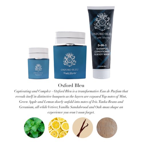 Captivating and complex, Oxford Bleu is a transformative Eau de Parfum that reveals itself in distinctive bouquets as the layers are exposed. Top notes of mint, green apple and lemon slowly unfold into notes of iris, tonka beans and geranium, all while vetiver, vanilla, sandalwood and oakmoss shape an experience you won't soon forget.
