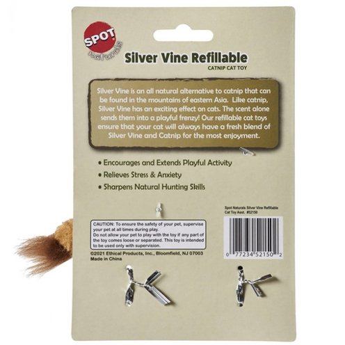 Silver vine is a natural material cats are intensely attracted to. Refillable toys feature an opening to insert fresh silver vine. Assorted styles.