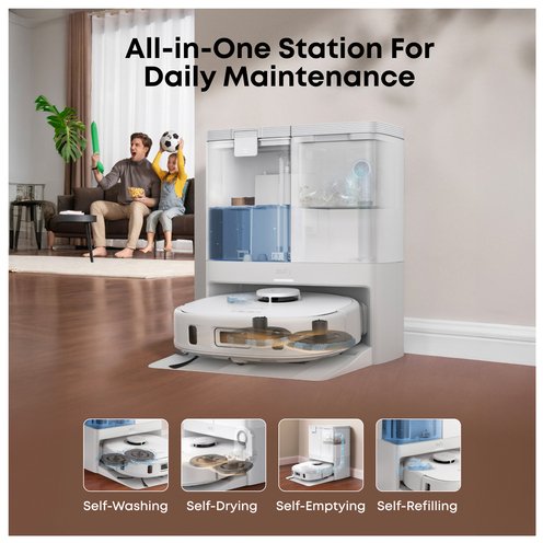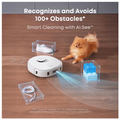 Enjoy effortless cleanliness and elegance with the eufy RoboVac X10 Pro Omni. Revolutionizing today's hands-free cleaning, the All-in-One Station handles floorcare while you spend time on what matters. It eliminates odors and bacteria with auto washing and drying of mop pads using heated 45°C air while a 2.5L dust bag eliminates the hassle of manual disposal for up to two months. The 3L water tank can mop expansive spaces (1,500�2,000 sq ft) 2�3 times between refills, ensuring floors stay clean without interruption. With stellar 8,000 Pa suction power, it vacuums deep into carpets, lifting pet hair and debris particles in one pass. The MopMaster 2.0 system delivers 180 rotations per minute and 1 kg of downward pressure, erasing stubborn stains effortlessly, while its auto-lifting feature detects carpets and raises mops by 12 mm to preserve dryness. Equipped with AI.See technology, it identifies over 100 objects-shoes, toys, wires-even in low light, and navigates smartly via iPath Laser Navigation for optimal routes. Customize cleaning scenarios via the app, set No-Go Zones with AI.Map 2.0, or let the Auto-Detangling Roller Brush reverse and free itself of hair tangles-itself. Its sleek white finish is a harmonious blend of cutting-edge deep cleaning and minimalist design that seamlessly integrates into any modern home's aesthetics, blending sophistication with unmatched convenience.