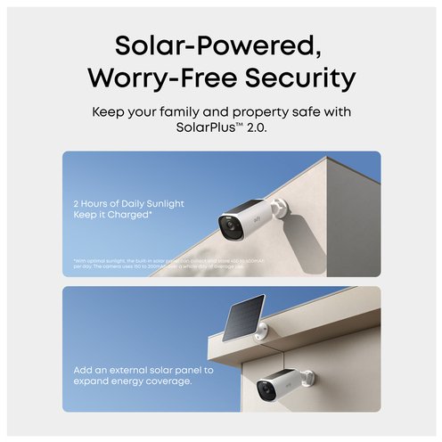 - SolarPlus™ 2.0 technology ensures non-stop security with efficient charging. Use the built-in panel or add an external panel to expand energy coverage. The camera stays powered even on cloudy days or in partial shade.
