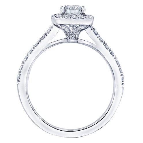 Shimmering lab grown round diamonds halo a brilliant 0.50 Carat round diamond at the center of this eye-catching engagement ring in a cushion frame. Additional diamonds line the 14K gold band to bring the ring's total diamond weight to 1.00 Carat. Available in size 7.