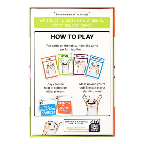 Meet the action-packed card game full of high fives and havoc! Created by Tim Ferriss, the mind behind The 4-Hour Workweek, Tools of Titans, and more, this card game gets everyone locked in and laughing. It’s simple to learn but hard to master