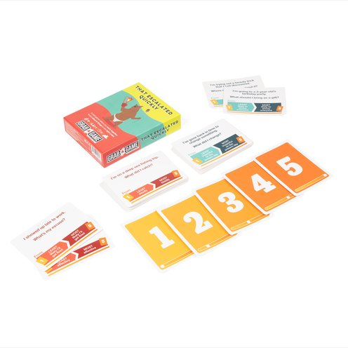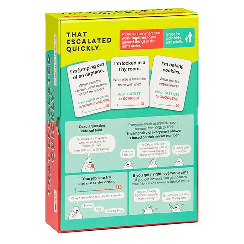 To play That Escalated Quickly: Grab and Game Edition read out a simple question (ex. I’m locked in a tiny room. What else is locked in here with me from cutest to scariest). Then everyone is assigned a secret number from one to five. Next, each player answers the question, and the intensity of that answer is based on their secret number (ex. 1= a bunny,5= a grizzly bear with chainsaw arms.) Finally, the person who read the question has to try and sort those answers into the correct order. If they get it right, everyone wins.