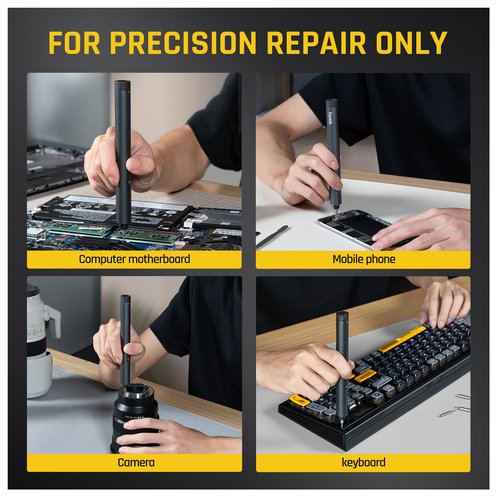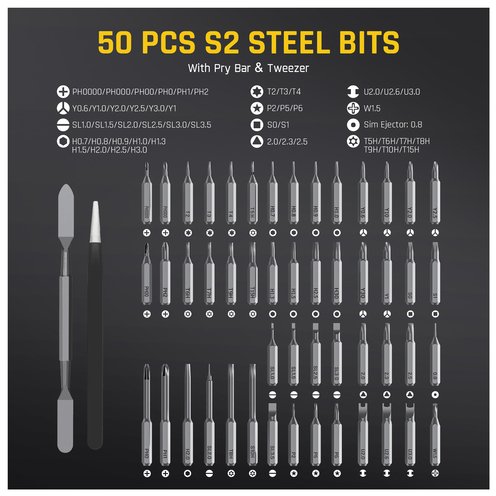 - It is equipped with a set of 12 different types of precision repair bits, offering a total of 50 high-quality bits. Made from durable S2 tool steel with a hardness rating of 60 HRC, these magnetized bits ensure a firm grip on screws during repairs. The kit also goes with a tweezer and a pry bar to assist with delicate disassembly tasks. Compatible with a wide range of electronic devices and small products such as smartphones, laptops, cameras, drones, glasses, and hard drives