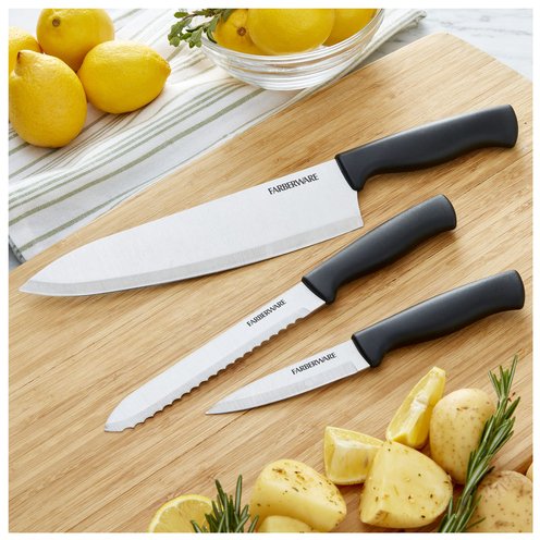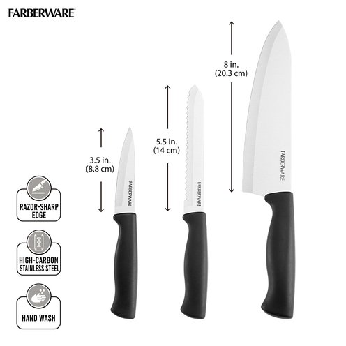 Add essential everyday knives to your kitchen while always having the right knife on hand with this Farberware 3 Piece Chef Set. This knife features a high-carbon stainless steel blade and is perfectly weighted for balance and control when cutting. It features a black polypropylene handle that is easy to hold onto when cutting.The knife blade is expertly crafted from superior quality, high-carbon stainless steel, which ensures the blades retain it's ultra-sharp edge longer than conventional stainless steel. The ergonomically designed handles provide exceptional strength, comfort, and durability. This set includes and 8 inch chef, 5.5 inch utility and a 3.5 inch paring knife. Hand-wash knives with warm water and a mild detergent then rinse and dry immediately.
