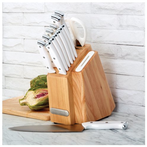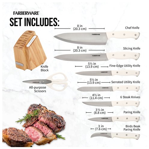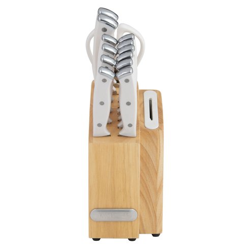 Always have the right sharpened knife on hand, with this Farberware Triple Rivet White Slim Cutlery Block Set with Built-In Edgekeeper Sharpener. Each knife has a fine edge, high-carbon stainless steel blade and ergonomically designed plastic handle that provides a comfortable grip. The slim design saves counter space, and the set features white handles with triple rivets and endcap accents in a natural hardwood block that complements any decor and keeps all your essential knives organized and within reach on your countertop. This unique block also features an Edgekeeper Sharpener slot. If you need to sharpen a blade, simply slide it in and out of the slot for a quick and convenient edge enhancement.