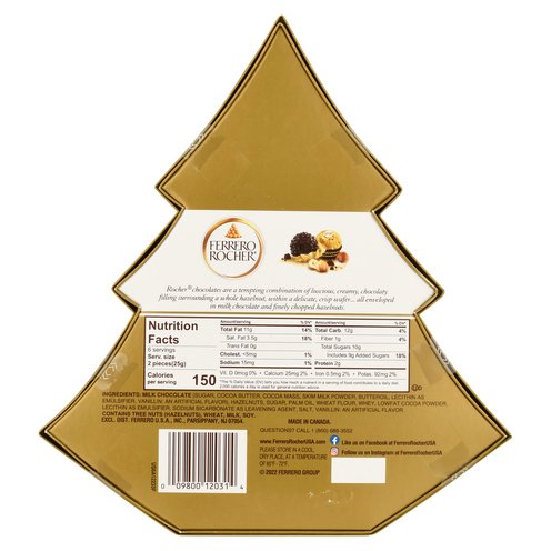 The Ferrero Rocher® Tree is the perfect festive gift and adds a golden touch to the decorations at any holiday celebration. Open up the seasonally decorated box and discover 12 iconic Ferrero Rocher® chocolates inside - a whole crunchy hazelnut in delicious creamy filling, encased in a crispy wafer shell, covered with milk chocolate and gently roasted hazelnut pieces.