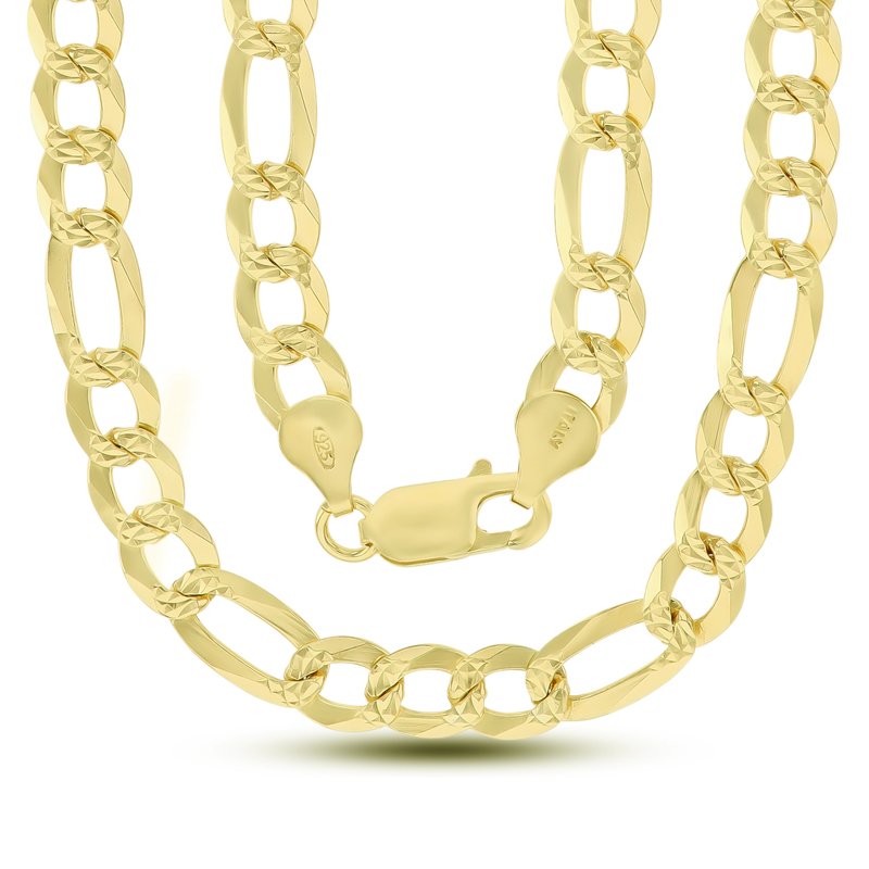 Genuine 925 sterling silver. 14k yellow gold bonded to silver underneath so color lasts many many years and doesn't wear out easily. A neck chain can be worn for a casual everyday look yet it can complement a more upscale outing. This sterling silver chain is designed to fit comfortably and lay easily on your neck. Diamond cut solid figaro link chain.