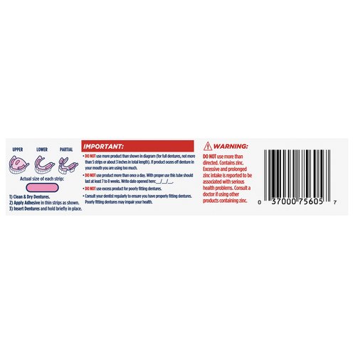 - Important: Do not use more product than shown in diagram (for full dentures, not more than 5 strips or about 3 inches in total length). If product oozes off denture in your mouth you are using too much. Do not use product more than once a day. With proper use this tube should last at least 7 to 8 weeks. Write date opened. Do not use excess product for poorly fitting dentures. Consult your dentist regularly to ensure you have properly fitting dentures. Poorly fitting dentures may impair your health. Warning: Do not use more than directed. Contains zinc. Excessive and prolonged zinc intake is reported to be associated with serious health problems. Consult a doctor if using other products containing zinc. Safety Feature: Do not use if carton is open or torn.
