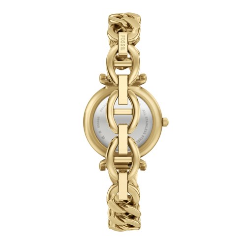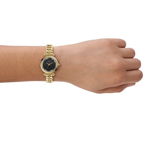 A gold-tone stainless steel bracelet complements the round gold-tone case, creating a cohesive and polished look. The glossy black dial adds depth with its rich, smooth finish, while sleek hands offer understated functionality. Designed for effortless wear, the curb chain bracelet features an 'Adjust-O-Matic' closure for a customizable fit.