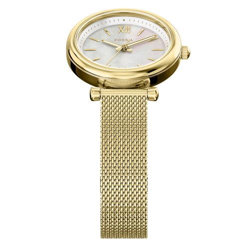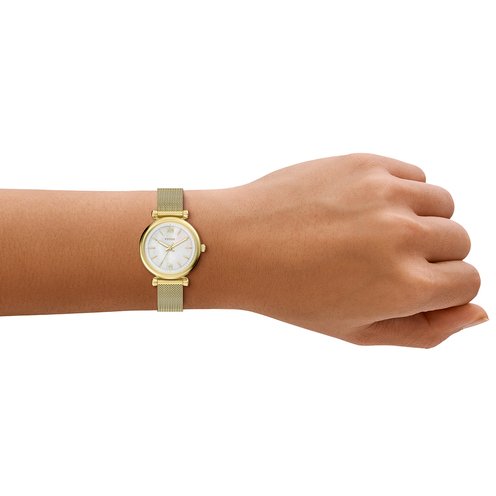 A glossy, mother-of-pearl-white sets a luminous tone against the gold-tone stainless steel case, accented with slim hands and markers for a refined finish. The gold-tone stainless steel mesh band adds a bright contrast and features an adjustable safety sliding buckle for a tailored fit.