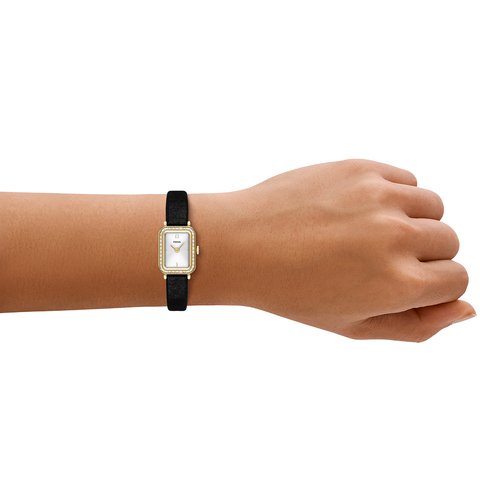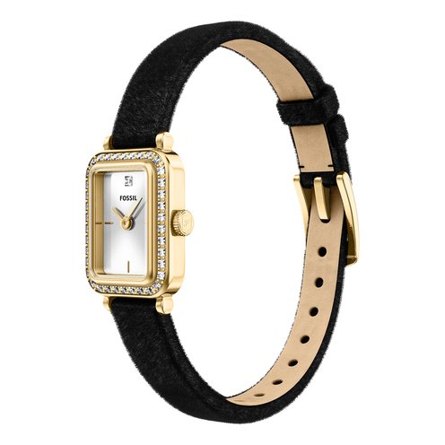 A gold-tone rectangular case pairs with a black velvet fabric strap for a clean, understated look. The silver sunray dial adds subtle texture and contrast, featuring a two-hand movement for streamlined timekeeping.