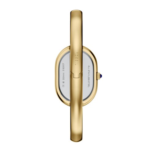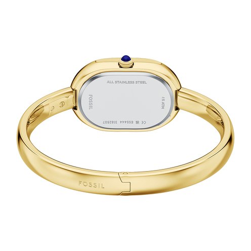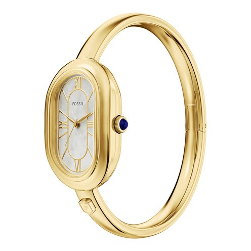 The gold-tone stainless steel jewelry-inspired bangle bracelet pairs seamlessly with the oval case to create a sleek and sophisticated bangle watch. The shiny mother-of-pearl dial, accented with gold-tone hands and indices, enhances the watch's radiant elegance and cohesive design. The bangle bracelet features a convenient push-button closure engraved with the Fossil shield logo, allowing for easy wear and removal.