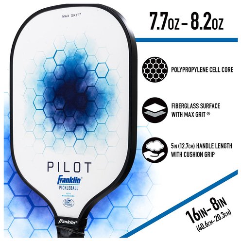 Take your pickleball game to the next level with the USA Pickleball (USAPA) approved Franklin Sports Pilot Pickleball Paddle! This polypropylene core pro pickleball racket is lightweight and designed for high performance. The honeycomb polypropylene core provides a strong, durable construction that is built to last, while only weighing from 7.7 - 8.2 ounces. This lightweight pickleball racket is also constructed with a non-slip, comfort grip that makes it easy to control on the court. The paddle is coated with our MaxGrit fiberglass surface layer, increasing traction on the pickleball for ultimate spin and finesse shots. Complete with a rugged edge protection band, this pickleball racket is built to perform at the highest level year after year. So step up your game and grab yourself the USA Pickleball (USAPA) approved Pilot Pickleball Paddle today from Franklin Sports!