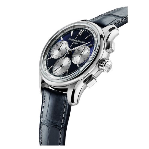 The sporty Flyback Chronograph Manufacture is a one-of-a-kind accessory. This stainless steel model with a navy blue leather strap was conceived and perfected over 6 year in the manufacture. The patented star-shaped wheel permits a uniquely smooth operation of the mechanism. This series can be stopped, reset to zero and restarted with the push of one button.