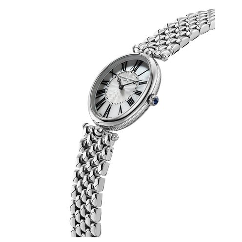 A perfect elegant oval silhouette, the Art Deco has become a modern classic. This feminine timepiece features a mother-of-pearl and guilloche decorated dial with black printed roman numerals on stainless steel jewelry inspired bracelet.