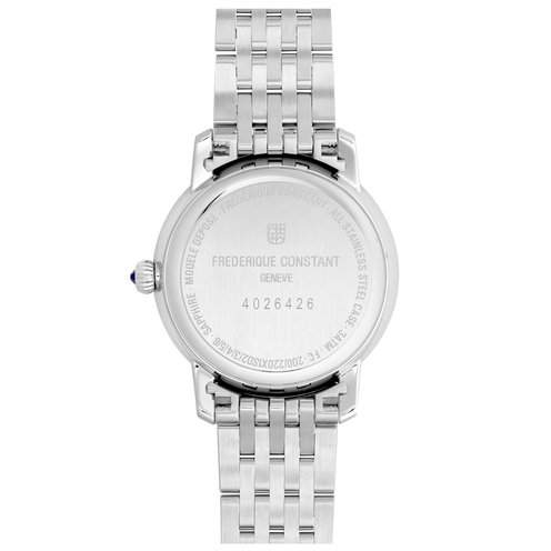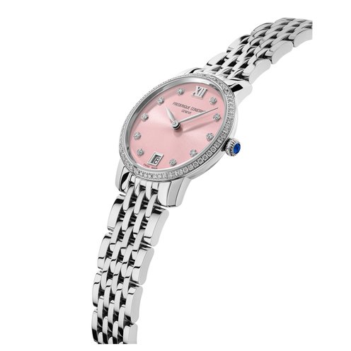 With a delicate 30mm diameter, the Classics Slimline Ladies has been designed to emphasize the soft curves of the wrist with harmony and sensitivity. Polished stainless steel 3-part case with 68 diamonds on the bezel and 10 diamond indexes. The pink dial with sunray finishing make this timepiece stand out with grace and elegance.
