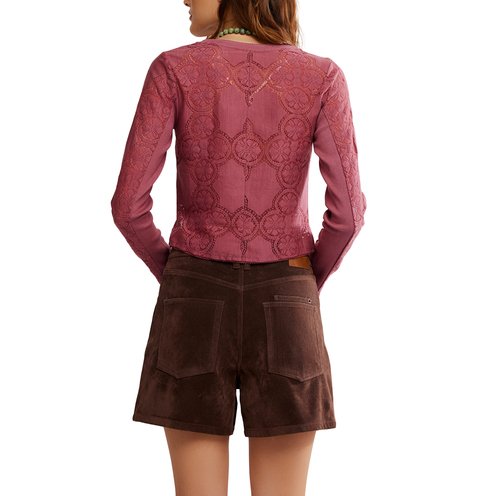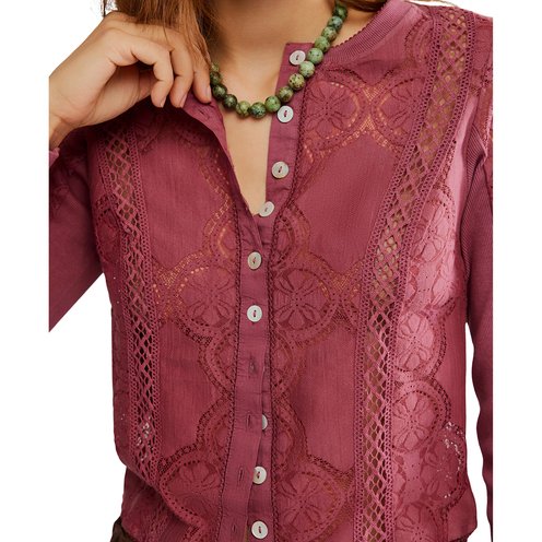 Add a dainty touch to your look with this sheer cotton-lace long sleeve, featured in a button-front style for a versatile piece that's perfect for layering.