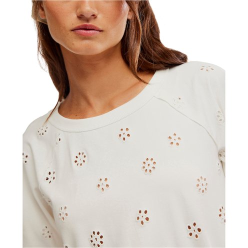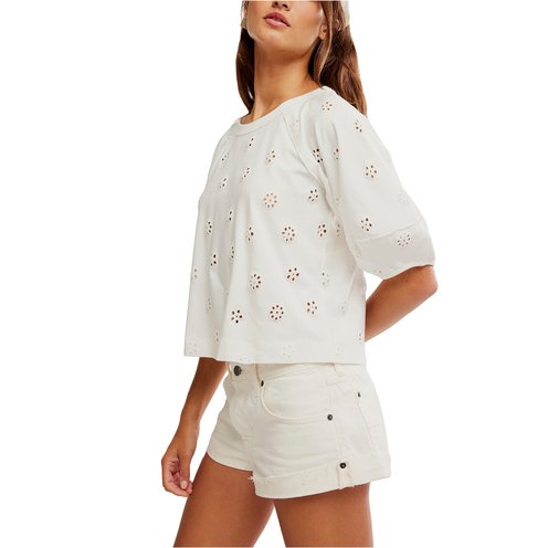 Look no further, you just found your perfect tee! Discover the Jessie Eyelet Tee by Free People, a boho chic style perfect for a summer engagement event. This whisper white tee highlights short puff sleeves and intricate eyelet detailing for a textured appearance. Crafted from a comfortable cotton blend. The pull on tee features a crewneck design and requires machine wash with line drying to maintain its quality.