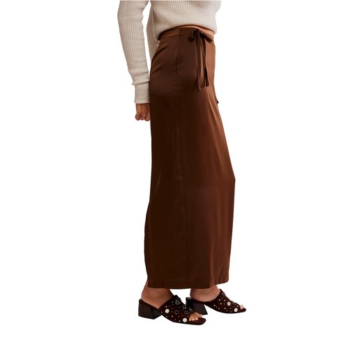 The definition of sleek, this stunning maxi skirt is featured in a classic column design and satiny fabrication with bow ties at the hips for a femme finish.