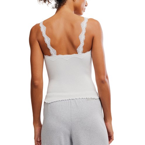 Delicate lace traces the neckline and straps of a form-fitting tank crafted from a supersoft rib.