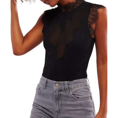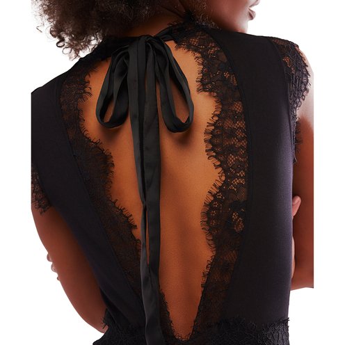 So romantic in every way, this lace-adorned bodysuit from Intimately features eyelash cap sleeves and mock neckline, complete with an open back and ribbon detail.