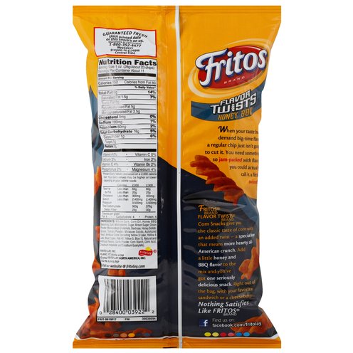 Guaranteed fresh. 0 grams trans fat. When your taste buds demand big-time flavor, a regular chip just isn't going to cut it. You need something so jam-packed with flavor you could actually call it a little twisted. Fritos brand flavor Twists brand Corn Snacks give you the classic taste of corn with an added twist - a special shape that means more hearty all-American crunch. Add a little honey and BBQ flavor to the mix and you've got one seriously delicious snack. Right out of the bag, with your favorite sandwich or a cheeseburger - nothing satisfies like Fritos brand.