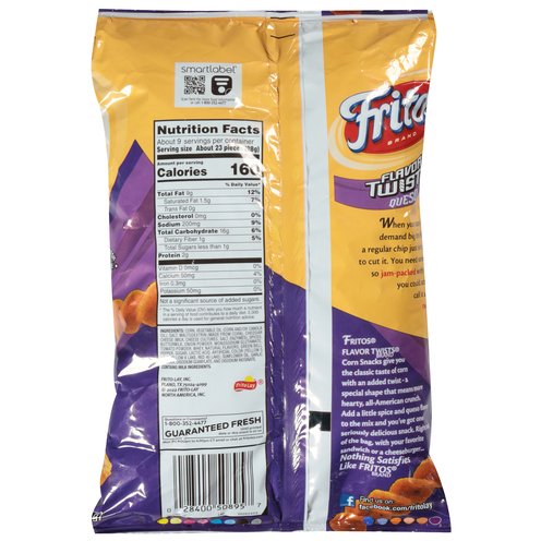 When your taste buds demand big-time flavor, a regular chip just isn't going to cut it. You need something so jam-packed with flavor, you could actually call it a little twisted. Fritos Flavor Twists Corn Snacks give you the classic taste of corn with an added twist - a special shape that means more hearty, all-American crunch. Add a little spice and queso flavor to the mix and you've got one seriously delicious snack. Right out of the bag, with your favorite sandwich or a cheeseburger... Nothing Satisfies Like Fritos Brand.