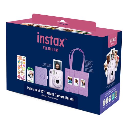 The super bubbly instax mini 12™ instant camera bundle is bursting with joy, creativity and color. Not only is this iconic instant camera available in a super fun bundle, it’s fully loaded with easy-to-use modes and controls. Designed to keep up with life, the instax mini 12™ instant camera is ready to go with a simple twist of the lens. Twist again and you’re in Close-up mode, perfect for selfies. Combined with the perfectly positioned selfie mirror, automatic flash control and instax™ mini instant photos, the instax mini 12™ instant camera is a selfie extraordinaire. But that’s not all the Close-up mode can do. When activated, the viewfinder neatly pairs up with the lens, so what you see is what you get – no object shifts in your final instax™ photo! (FYI the fancy term for this is parallax correction.) Because when you’re this close, there’s no room for error. Plus, with automatic exposure, you can simply aim and click. No need to adjust any settings, just simply fun photos every time. And with that in mind, once you have snapped, your instax™ mini instant photo will eject in approximately five seconds (development time thereafter is approximately 90 seconds). All without compromising on image quality. That deserves high fives all around. When you’re finished capturing memories, twist the lens again to turn the instax mini 12™ instant camera off. But the fun doesn’t end there. Download the free instax UP!™ App to your Smartphone for a new way to keep all your instax™ photos digitally, in one place. All you have to do is use the instax UP!™ App and your Smartphone to scan your printed instax™ photos and they’ll be turned into sharable, digital photos that you can edit, tag and save. Ready to twist & go? Get the most out of your instax mini 12™ instant camera with film and these great accessories included in the bundle. Bundle includes: an instax mini 12™ instant camera Lilac Purple, one 10 pack of instax™ mini white border instant film to capture lasting memories, one sticker sheet of assorted designs, an instax™ mini printed Photo Album to hold up to 64 instax mini photos of your precious moments, a quilted tote bag that conveniently holds the instax mini 12™ camera, film pack, album and displays 3 instax™ mini photos on the outside of your choice in addition to an instax™ Photo Idea Booklet to let your imagination run wild with creative projects to create using printed instax™ photos.
